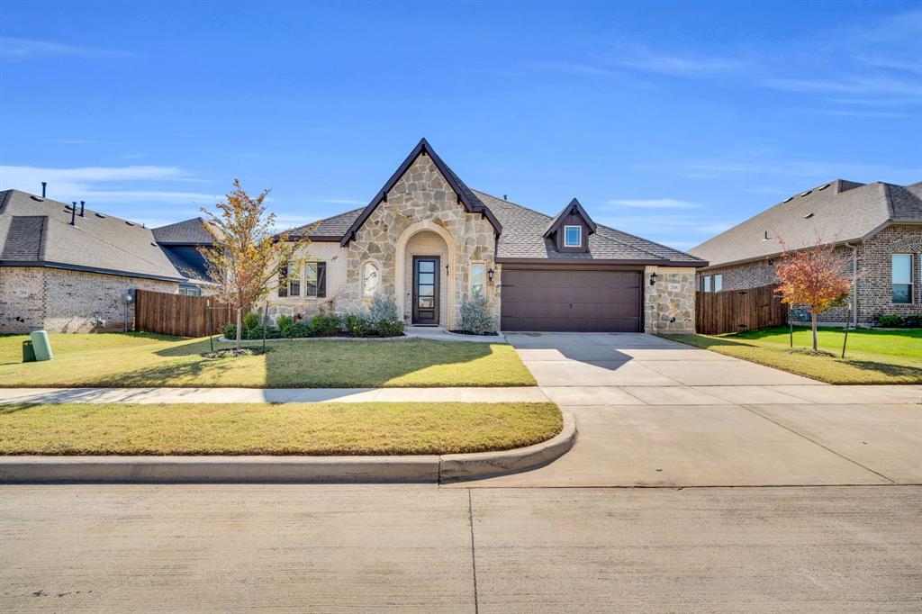 Stunning Bloomfield Homes Hawthorn plan, a nearly new, meticulously maintained single story beauty designed for bright, open living & effortless style. From the moment you step through the custom 8’ front door, you’re greeted by a dramatic octagonal foyer with curved walls, art niches, & glass French doors in Study, perfect for working from home or second living area. The heart of the home shines with an open-concept layout, soaring ceilings, & abundant natural light pouring through large strategically placed Low E windows. Ceramic tile flooring flows through all main areas, complementing the crisp quartz countertops & painted cabinetry. The chef-inspired kitchen features stainless steel appliances, an oversized island with designer pendant lighting, a walk-in pantry, & built in butler’s pantry for added storage & serving space, ideal for entertaining. Expansive Owner’s Suite is a true retreat, highlighted by a large bedroom & an upgraded bath featuring an enlarged shower, dual sinks & quartz countertops. Three additional secondary bedrooms are thoughtfully split from the primary suite, offering privacy for family or guests. Extended covered patio, complete with a ceiling fan & upgraded lighting, making it the perfect spot to unwind or host gatherings. The exterior showcases upgraded white brick with beautiful stone accents & a 2.5-car extended garage, adding the extra storage or workspace every homeowner appreciates. Refrigerator, washer & dryer convey. Easy compute to DFW & both airports.