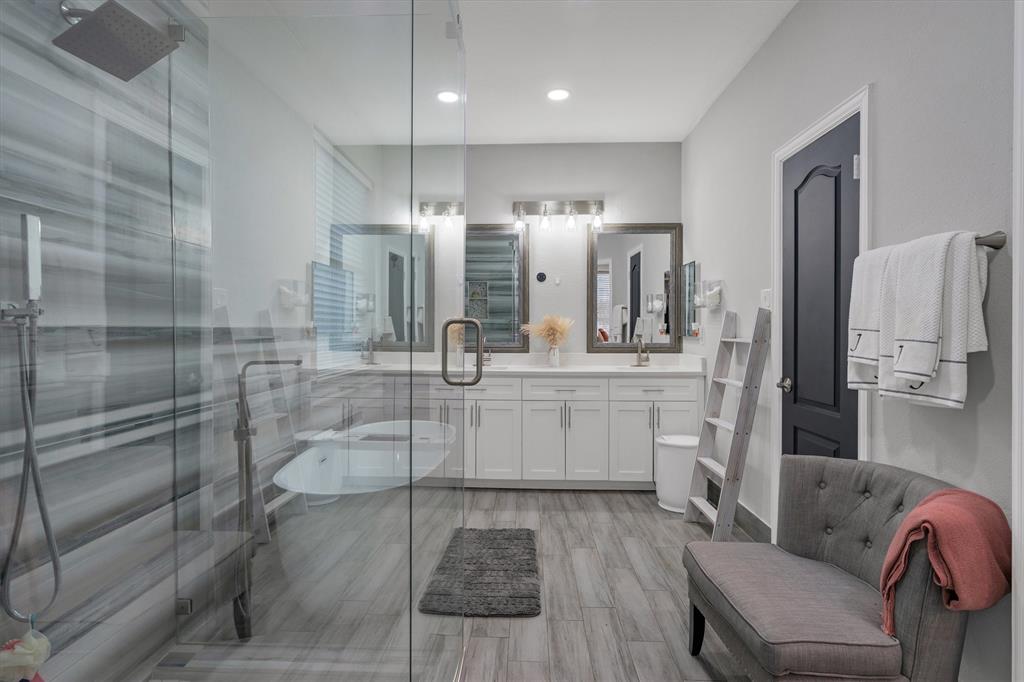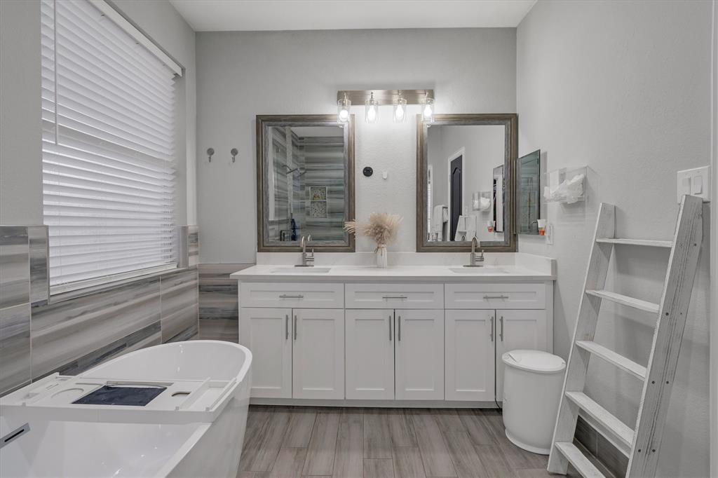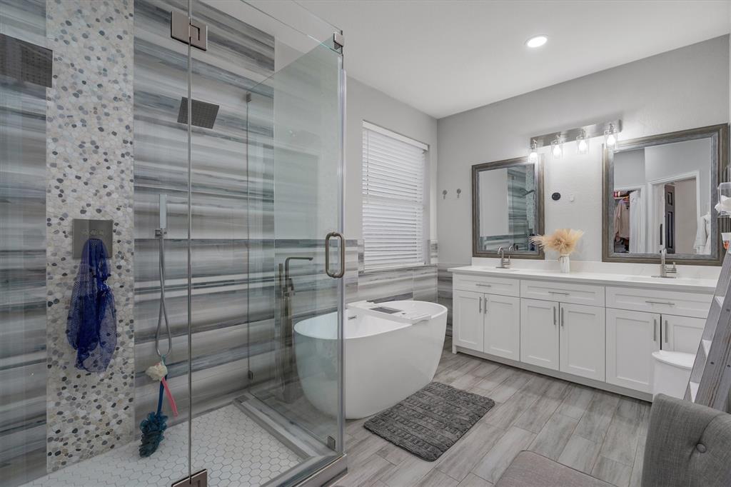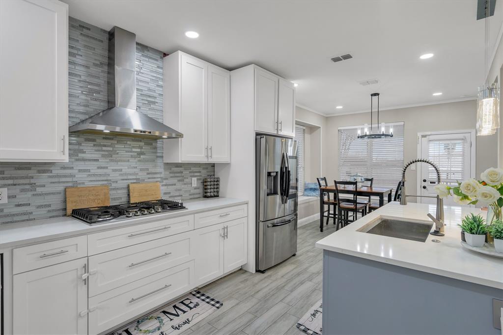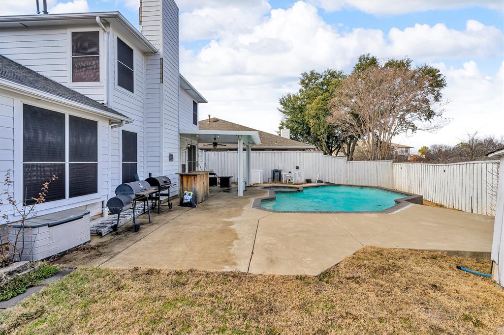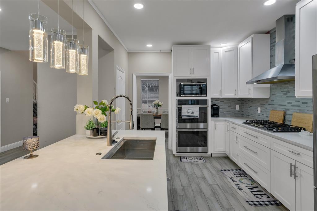 Beautifully updated home offering 4 bedrooms, multiple dining options, 3 spacious living areas, 2.5 baths, and a 2-car garage. The kitchen opens seamlessly to the breakfast area and main living space and features stainless steel appliances with double oven, a gas range with modern vent hood, custom cabinetry, quartz countertops, and a striking backsplash. The primary suite is conveniently located on the main level and includes a walk-in custom closet and a spa-inspired bath with a Victorian soaking tub. Wood-like tile flooring throughout with no carpet. No HOA. Enjoy cozy evenings by the wood-burning fireplace with gas starter. Upstairs features an open flex space ideal for a media room, game area, or additional living space. Step outside to a backyard retreat with an inground heated pool and covered patio, perfect for year-round enjoyment.